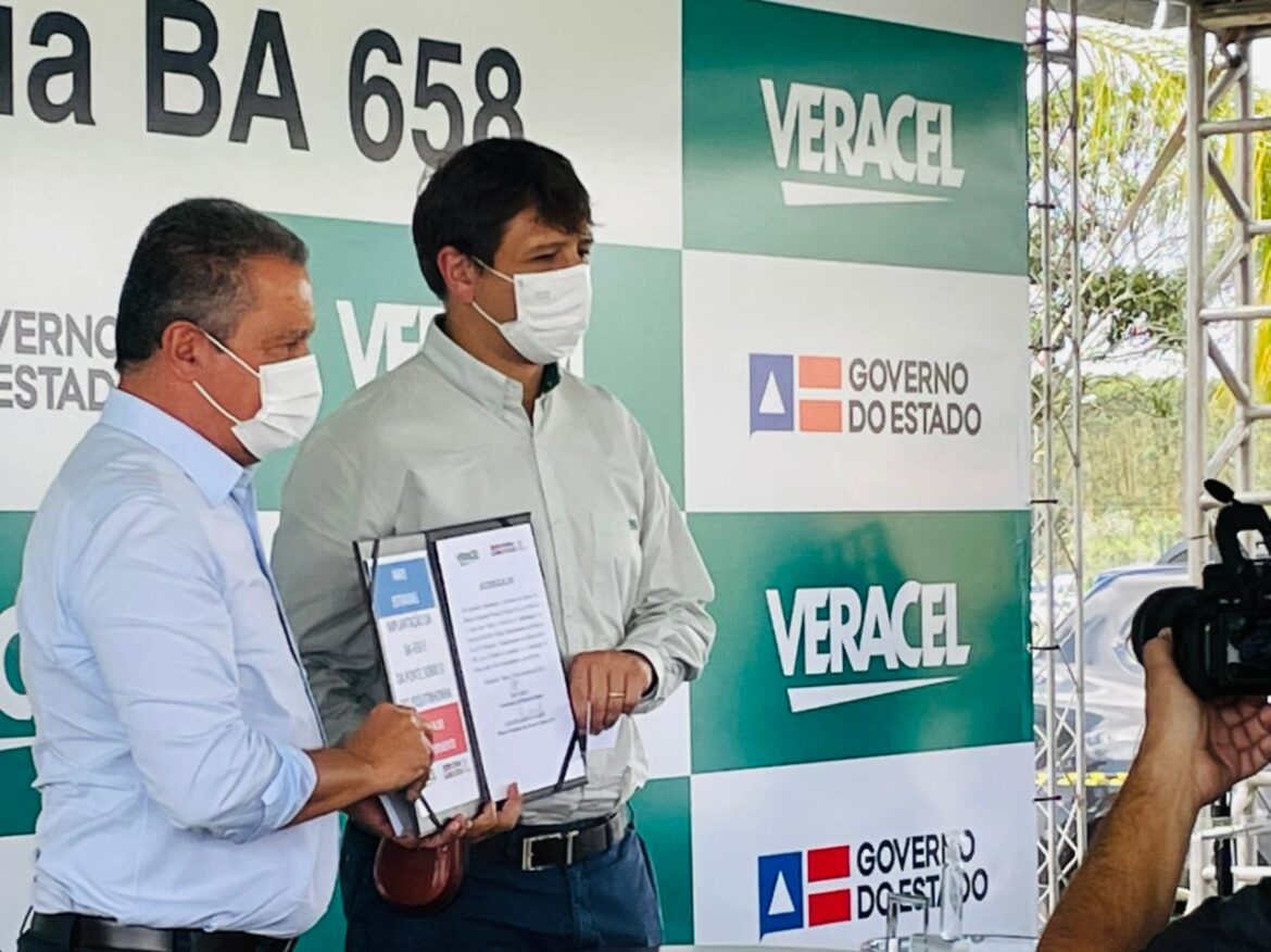 O Governo do Estado e a Veracel Celulose assinaram nesta sexta-feira (19) a ordem de serviço para a construção da BA-658. O ato aconteceu na sede da empresa, em Eunápolis, com a presença do governador Rui Costa e do diretor-presidente da Veracel, Caio Zanardo.