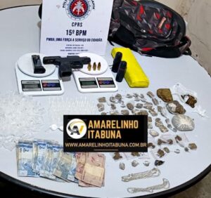 Material apreendido: 1kg de maconha, buchinhas de maconha prontas para comercialização, pinos de cocaína, duas balanças de precisão e uma pistola modelo 9mm.