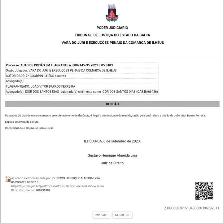 O juiz titular da Vara do Júri e Execuções Penais de Ilhéus, Gustavo Henrique Almeida Lyra, decidiu de forma monocrática, relaxar a prisão do policial militar João Vitor Barros Ferreira, lotado na 33ª CIPM/Valença.