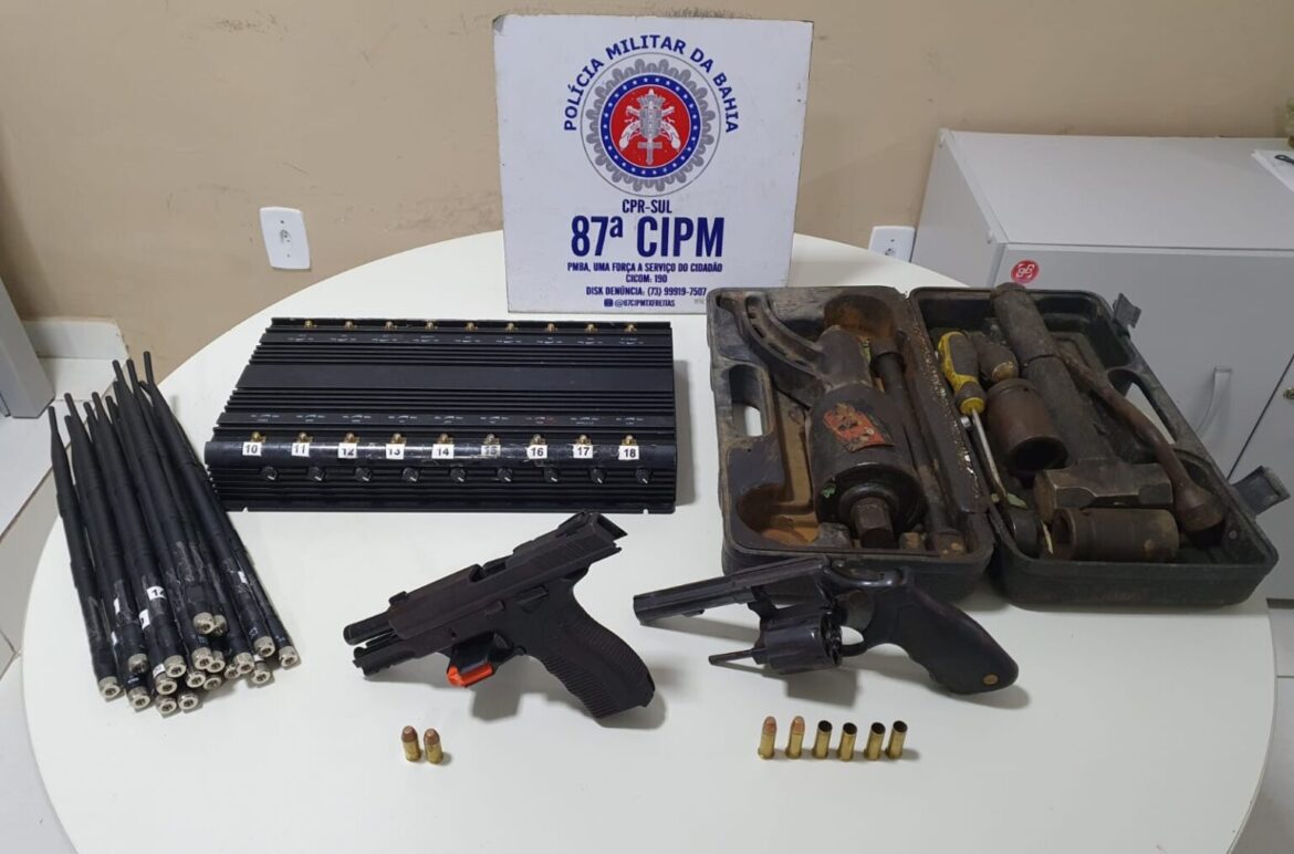 A Polícia Militar apreendeu uma pistola Taurus, com duas munições intactas e um revólver, também Taurus, calibre .38, com duas munições intactas e quatro deflagradas. Os suspeitos traziam um bloqueador de sinal de GPS e várias ferramentas que são utilizadas em roubo de cargas.