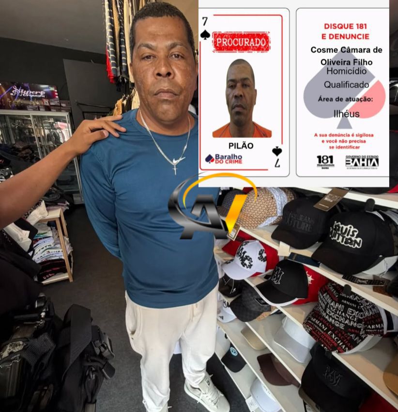 O detido é Cosme Câmara de Oliveira Filho, conhecido como “Pilão”, que figurava como o “7 de Espadas” no Baralho do Crime da Secretaria da Segurança Pública da Bahia (SSP-BA).